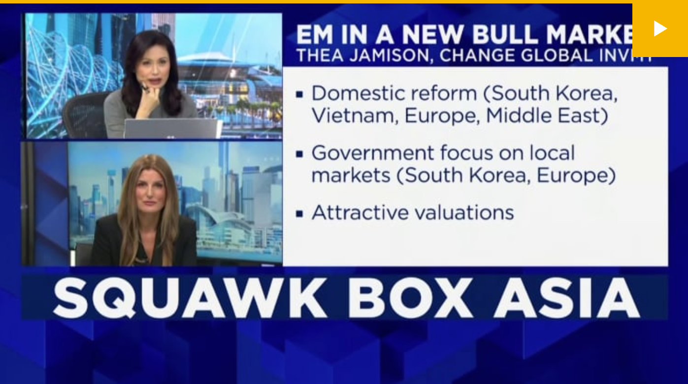 Thea Jamison, founder and managing director of CHANGE Global, says the firm believes emerging markets are still in the early stages of a cycle, citing improving fundamentals, signs of shifting capital flows, and compelling valuations.